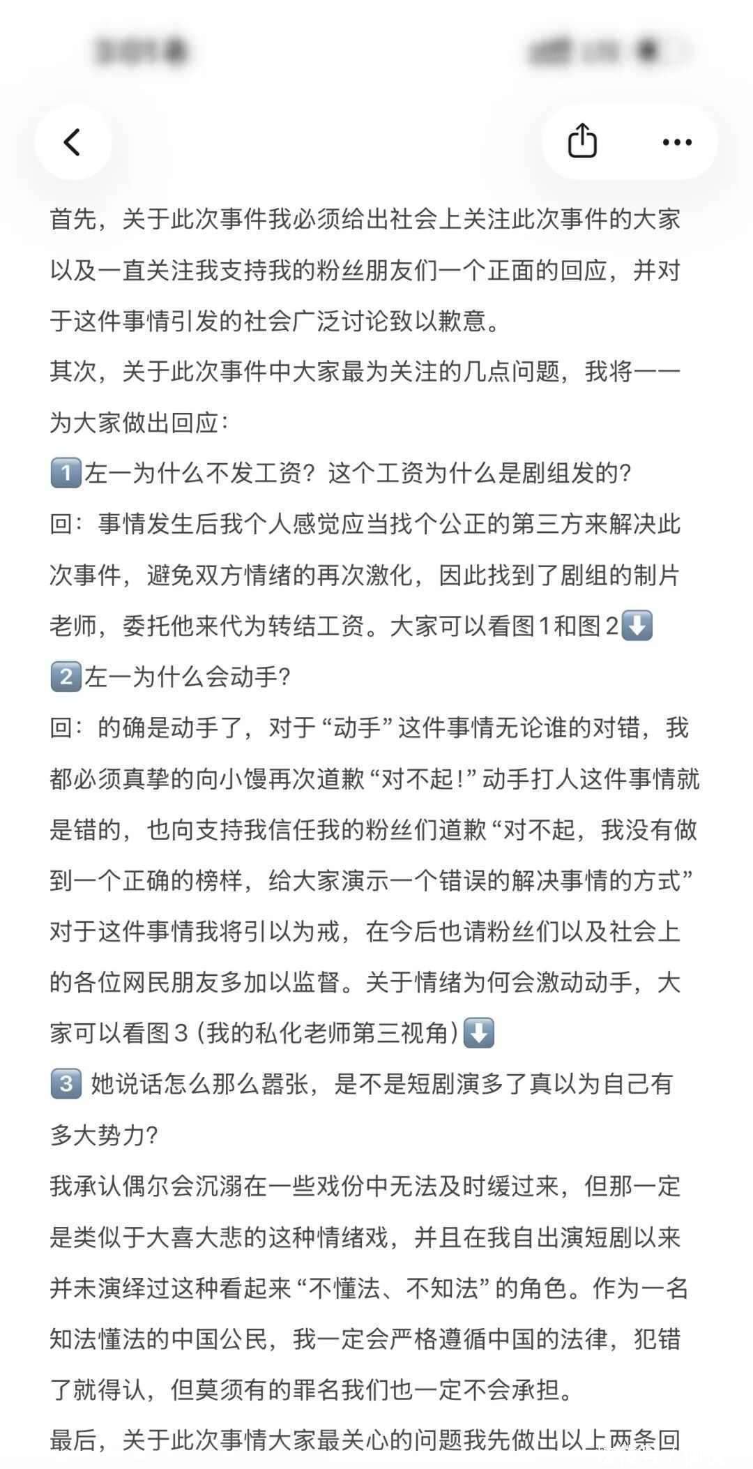 昨天凌晨,左一在社交平台上发了一篇长文,解释了整个事件。她承认确实打了助理,但工资未能及时支付,是因为两人之间发生了矛盾。左一不希望在剧组里碰面,觉得会更尴尬,于是就让制片老师代为转账。但是由于一些原因,助理一直没拿到钱,这才导致了两人的冲突。