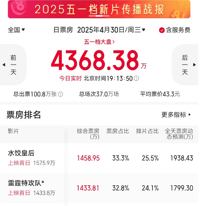 和国庆档、春节档是实际意义上的“国产片保护月”不同,这个五一档是国产电影和好莱坞大片的正面交锋,而4月30日这天,则是《水饺皇后》一支孤军和漫威超级大片《雷霆特攻队*》的短兵相接。