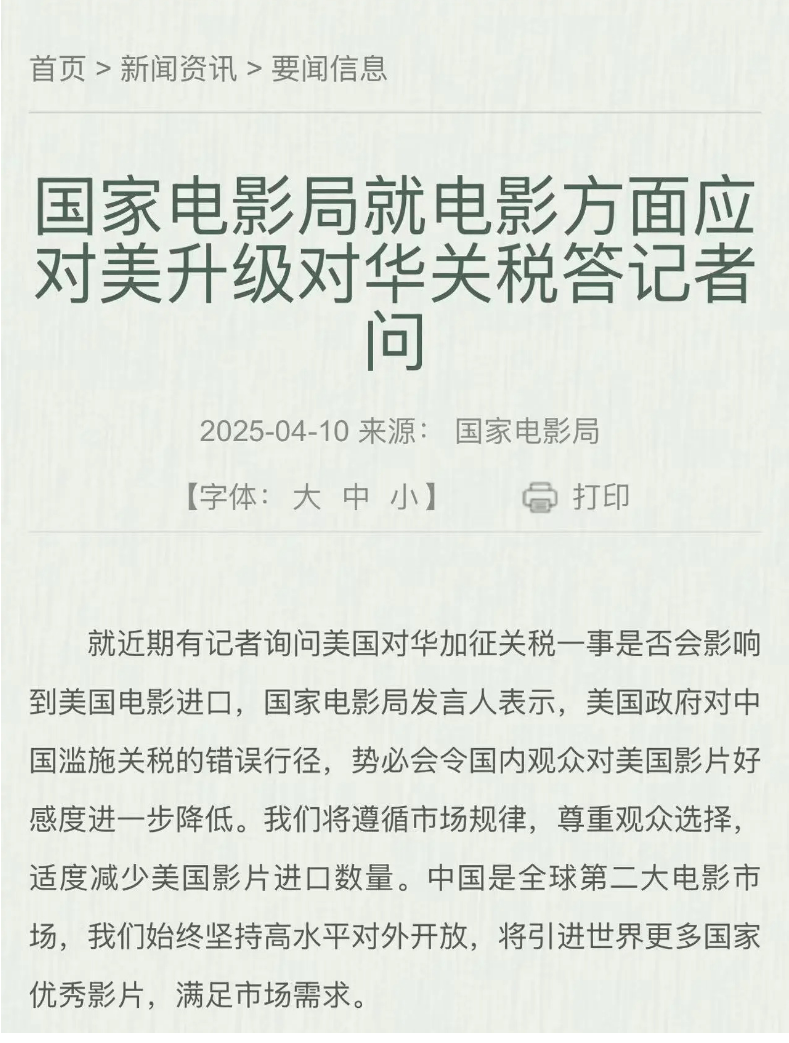 受关税战影响,4月10日电影局表示,关税问题势必会令国内观众对美国影片好感度进一步降低。我们将遵循市场规律,尊重观众选择,“适度减少美国影片进口数量。”同时强调将引进世界更多国家优秀影片,满足市场需求。