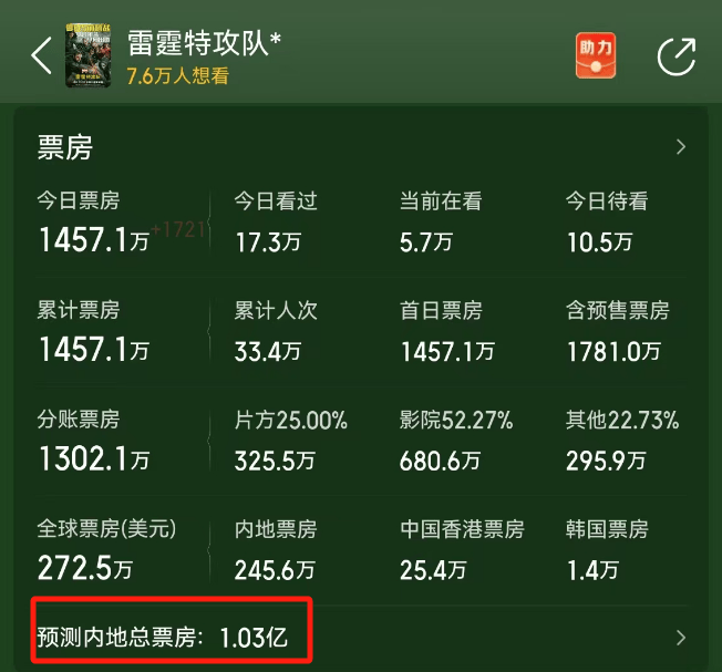 目前专业平台给《水饺皇后》的总票房预测是3亿多,从纪录片的维度来说这已经是成功数字,但相信随着口碑发酵,总票房会高出很多,更会遥遥领先《雷霆特攻队*》。