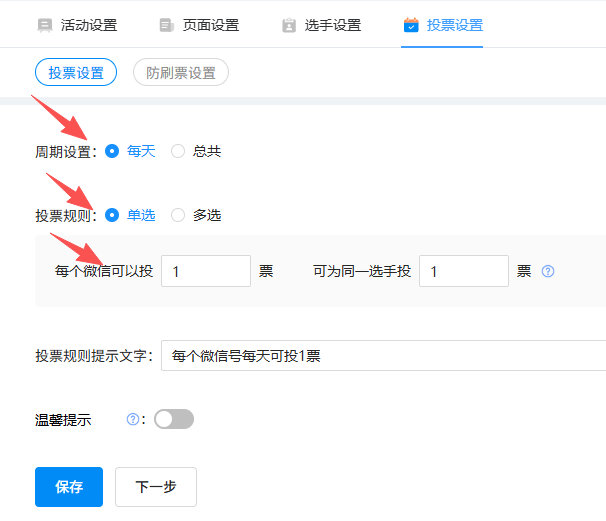 投票规则:周期、单多选、每人每天可投X票。