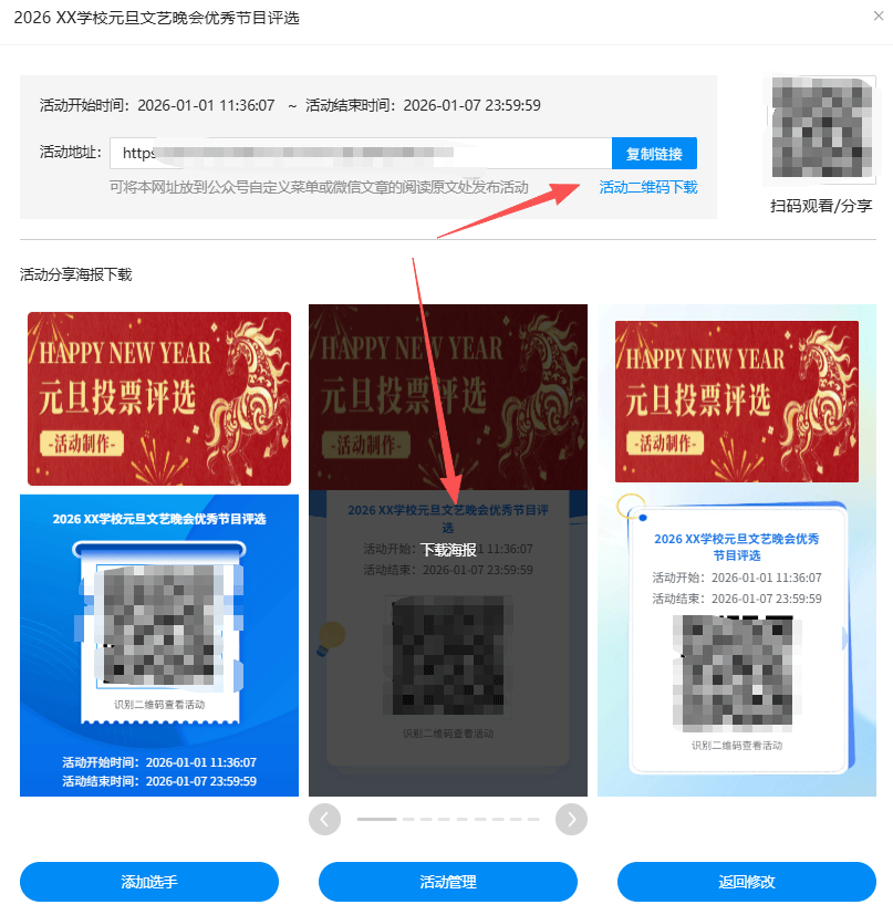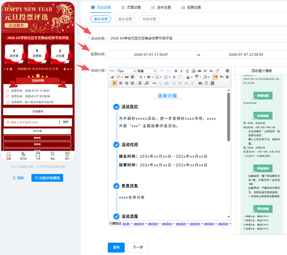活动名称:如“2026 XX学校元旦文艺晚会优秀节目评选”,设置投票开始与结束时间和活动介绍