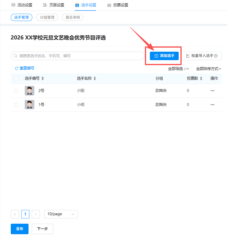 在“选手设置”-“选手管理”中,统一添加参选节目的名称、舞台照片/视频等。