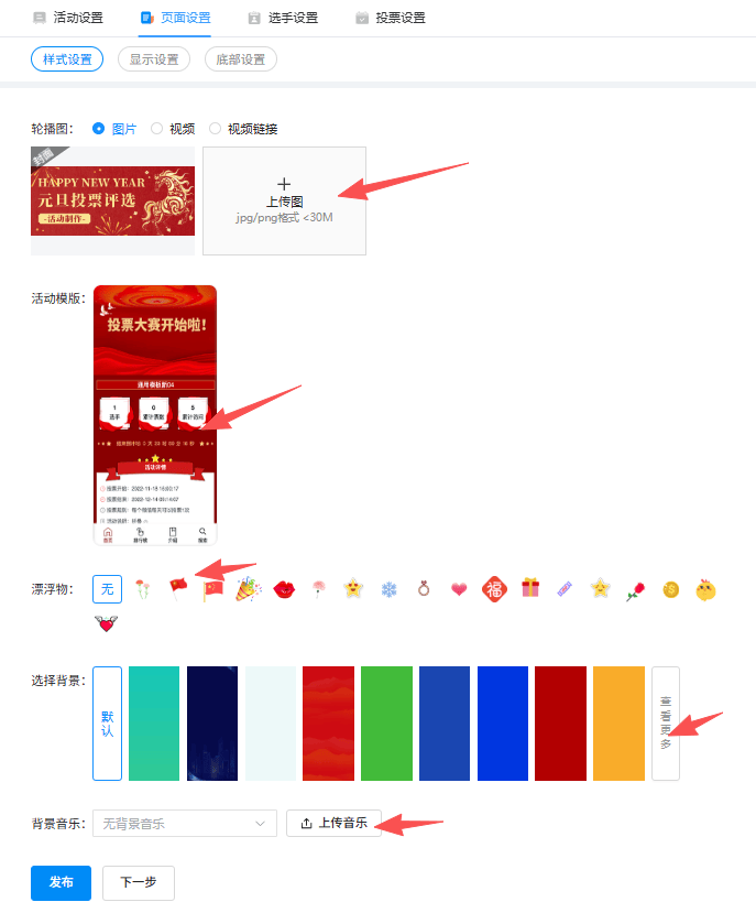 上传元旦主题封面图,从各种节日模板样式中选适配样式一键套用,启用雪花、灯笼、烟花登漂浮动效,上传《新年好》等 BGM,增加氛围。
