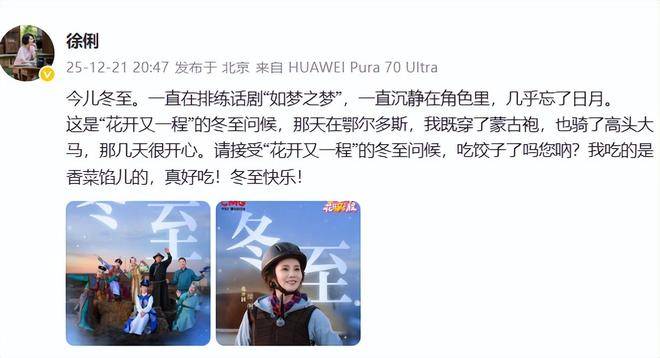 前CCTV-4女主播徐俐在退休两年后,近日迎来了儿子结婚的喜讯,而她也正式升级为奶奶了。2025年12月21日晚上8点47分,徐俐在个人社交平台上发布了一则动态,分享了自己冬至的心情和最新近况。她表示,自己正在参与话剧《如梦之梦》的排练,沉浸在角色中,几乎忘记了时间的流逝。她还提到,这次冬至自己在鄂尔多斯度过,身穿蒙古袍,骑着高头大马,度过了愉快的时光。她还通过这条动态向大家送上了冬至的问候,并调侃道:吃饺子了吗?我吃的是香菜馅儿的,味道真好!