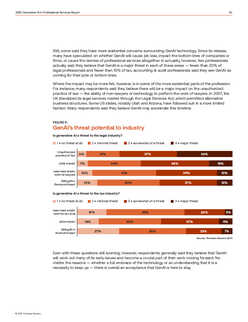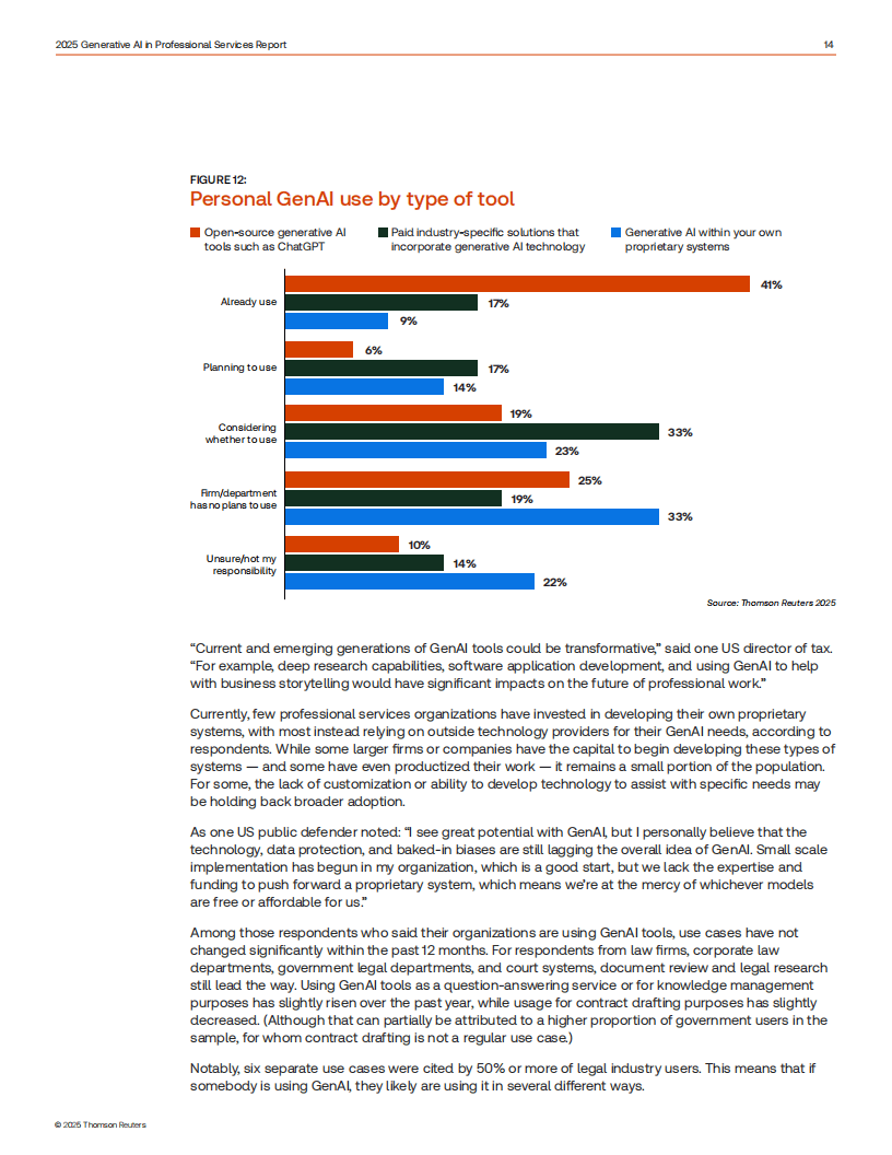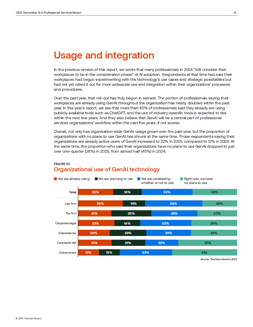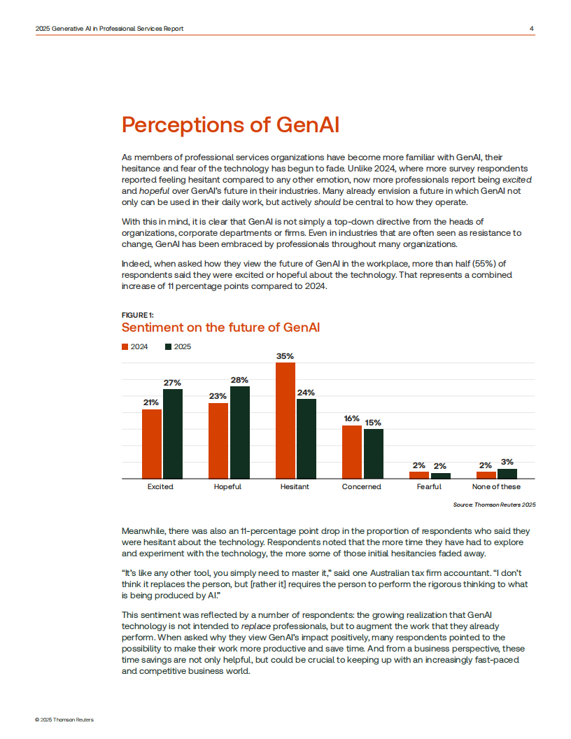 《2025年专业服务领域生成式人工智能报告》基于对法律、税务会计审计、企业风险欺诈及政府行业1702名从业者的调研,聚焦生成式AI(GenAI)在专业服务领域的应用现状、趋势与挑战。报告显示,GenAI adoption 呈稳步上升态势,41%的从业者个人使用ChatGPT等开源工具,17%使用行业专属付费工具,企业层面主动应用比例从2024年的12%增至2025年的22%,另有50%的企业处于规划或考量阶段。从业者对GenAI的态度愈发积极,55%表示兴奋或抱有希望,较2024年提升11个百分点,仅少数持犹豫或担忧态度,核心顾虑集中在准确性、错误信息及监管不足等问题。使用场景上,法律领域以文档审查、法律研究、文档摘要为主要应用,税务会计审计领域侧重税务研究、报税准备和税务咨询,风险欺诈领域则以文档摘要、风险评估与报告为核心,多数活跃用户每周至少使用一次GenAI。尽管应用广泛,但行业仍面临诸多短板:52%的企业缺乏GenAI使用政策,64%未提供相关培训,仅20%的企业衡量GenAI的投资回报率(ROI),且企业与客户间存在信息断层,71%的律所客户和59%的税务所客户不清楚合作机构是否使用GenAI。未来,95%的从业者预计GenAI将在五年内成为工作流程核心,行业需加快完善政策规范、强化技能培训、建立ROI衡量体系,并加强企业与客户间的沟通协作,让GenAI更好地发挥自动化低价值任务、提升效率、节省时间的核心价值,推动专业服务领域实现智能化转型。