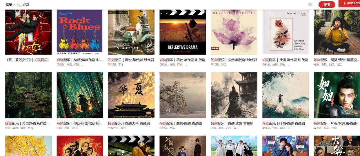 • 适配场景:系列短剧的长期配乐规划(如古装IP系列、地域特色短剧系列),其智能推荐功能可根据已选音乐风格,自动推送相似素材,保障多集作品配乐风格统一性。