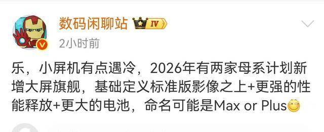 同时,按照博主数码闲聊站表示,今年两家母系品牌的小屏机有点遇冷,这里所谓的“母系”指的也就是vivo和OPPO,两家以前其实是同一家,也就是步步高手机。因为他们的小屏旗舰遇冷,为了稳住销量,自然会在2026年增加大屏旗舰来弥补,数码闲聊站表示新机可能是命名为Max或者Plus。