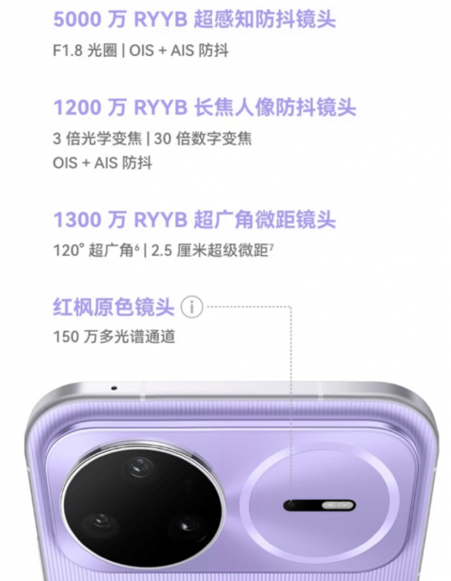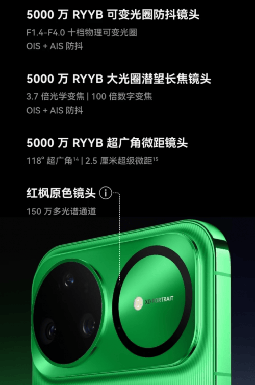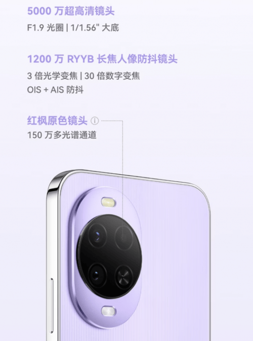 华为 nova 15 Ultra后置5000万RYYB可变光圈防抖镜头、5000万RYYB大光圈潜望长焦镜头、5000万RYYB超广角微距镜头、红枫原色镜头,前置5000万超聚光人像镜头、红枫原色镜头;后置全焦段红枫影像,带来0.5x广角人像、1x风光人像、2x黄金人像、3.7x长焦人像、5.6x特写人像。