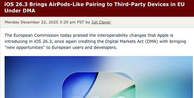 欧盟委员会表示,开发者可以利用 iOS 26.3 的这些新功能,对第三方电视、智能手表和耳机进行测试。该功能预计将于 2026 年在欧洲全面推出,旨在进一步构建一个更加互联互通的数字生态系统,让所有欧盟公民都能从中受益。同时,iOS 26.3 预计将于 1 月底正式发布,为欧盟的设备制造商和用户带来新的体验。