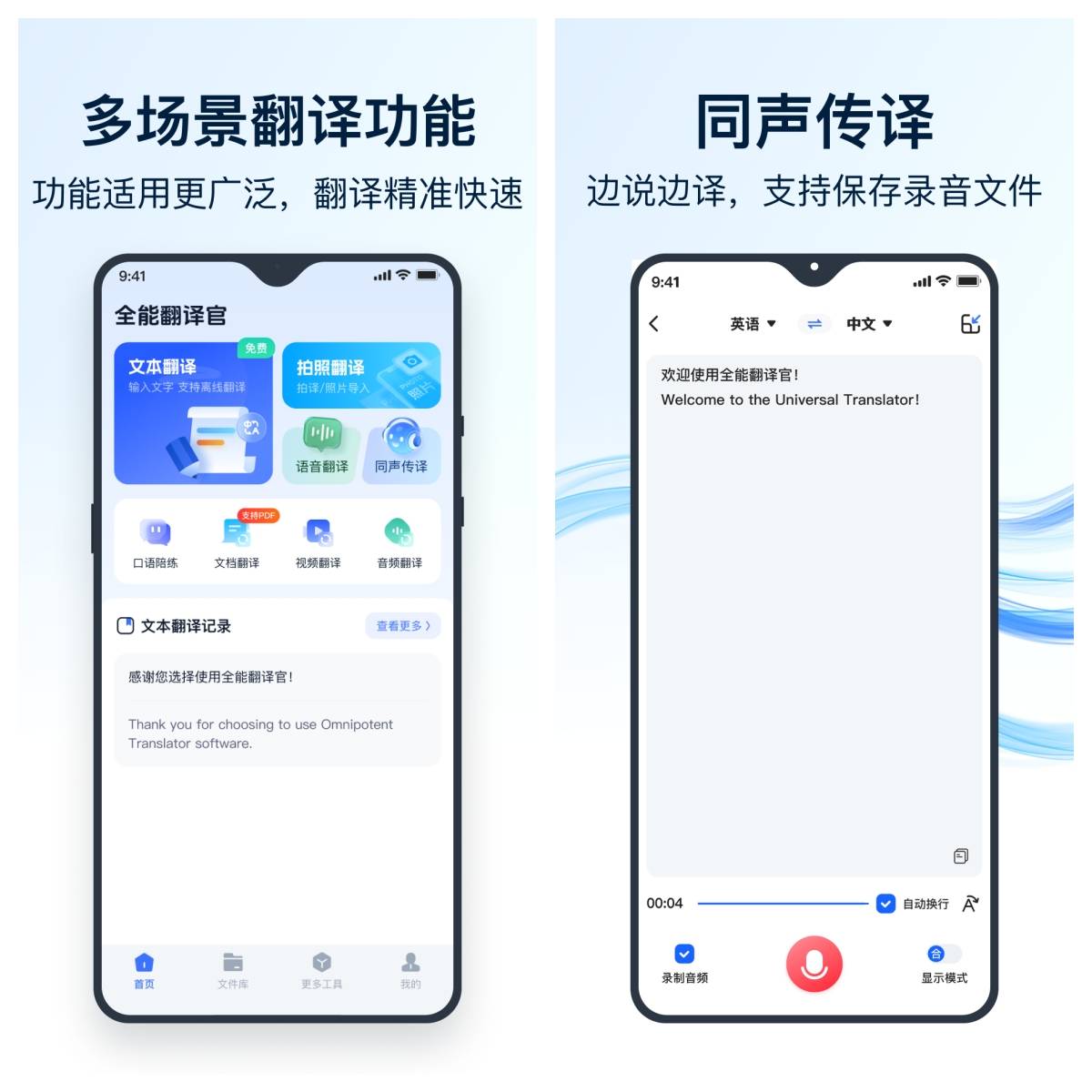 如果你收到的不是简单的几秒钟语音,而是一段较长的录音文件,或者是会议记录、课程录音,甚至是对准确度要求极高的商务语音,系统自带的实时字幕可能无法保存记录或精度不够。这时候,使用专业的第三方工具是更好的选择,这里推荐全能翻译官app。