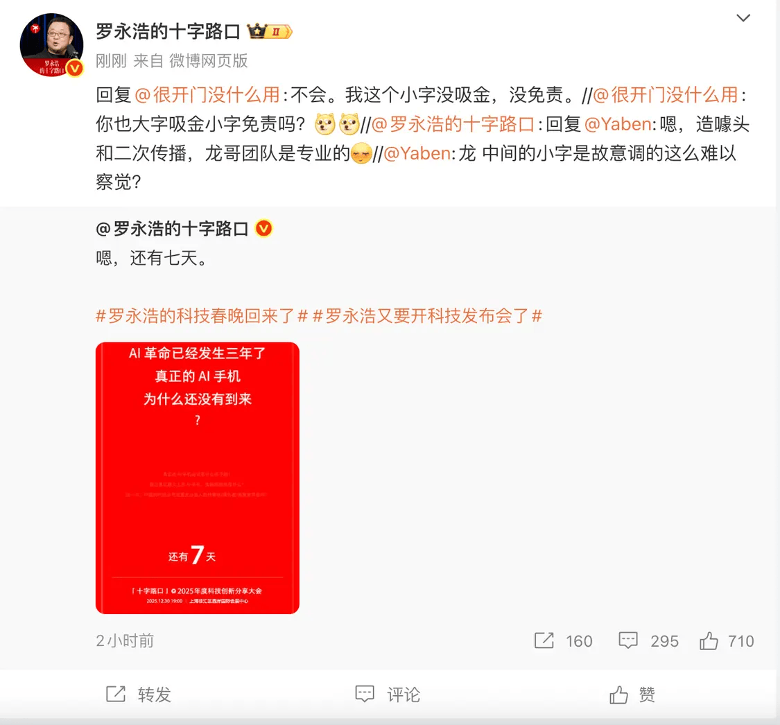 有网友提问:中间的小字是故意调的这么难以察觉?罗永浩回复称:嗯,造噱头和二次传播,龙哥团队是专业的。