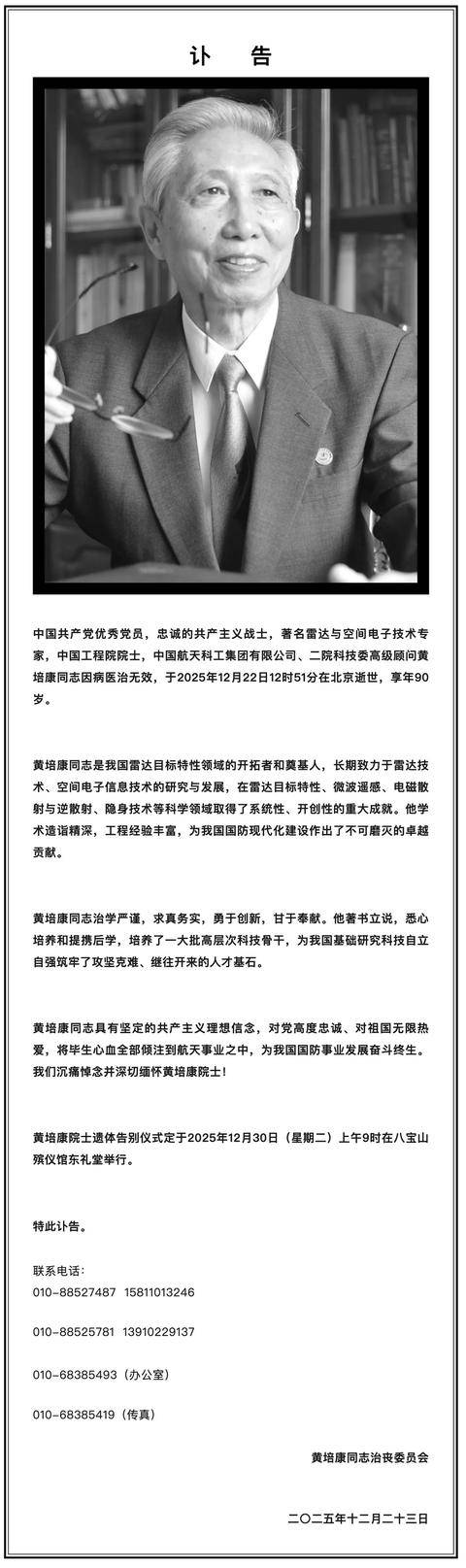 据中国航天科工官微消息,中国共产党优秀党员,忠诚的共产主义战士,著名雷达与空间电子技术专家,中国工程院院士,中国航天科工集团有限公司、二院科技委高级顾问黄培康同志因病医治无效,于2025年12月22日12时51分在北京逝世,享年90岁。