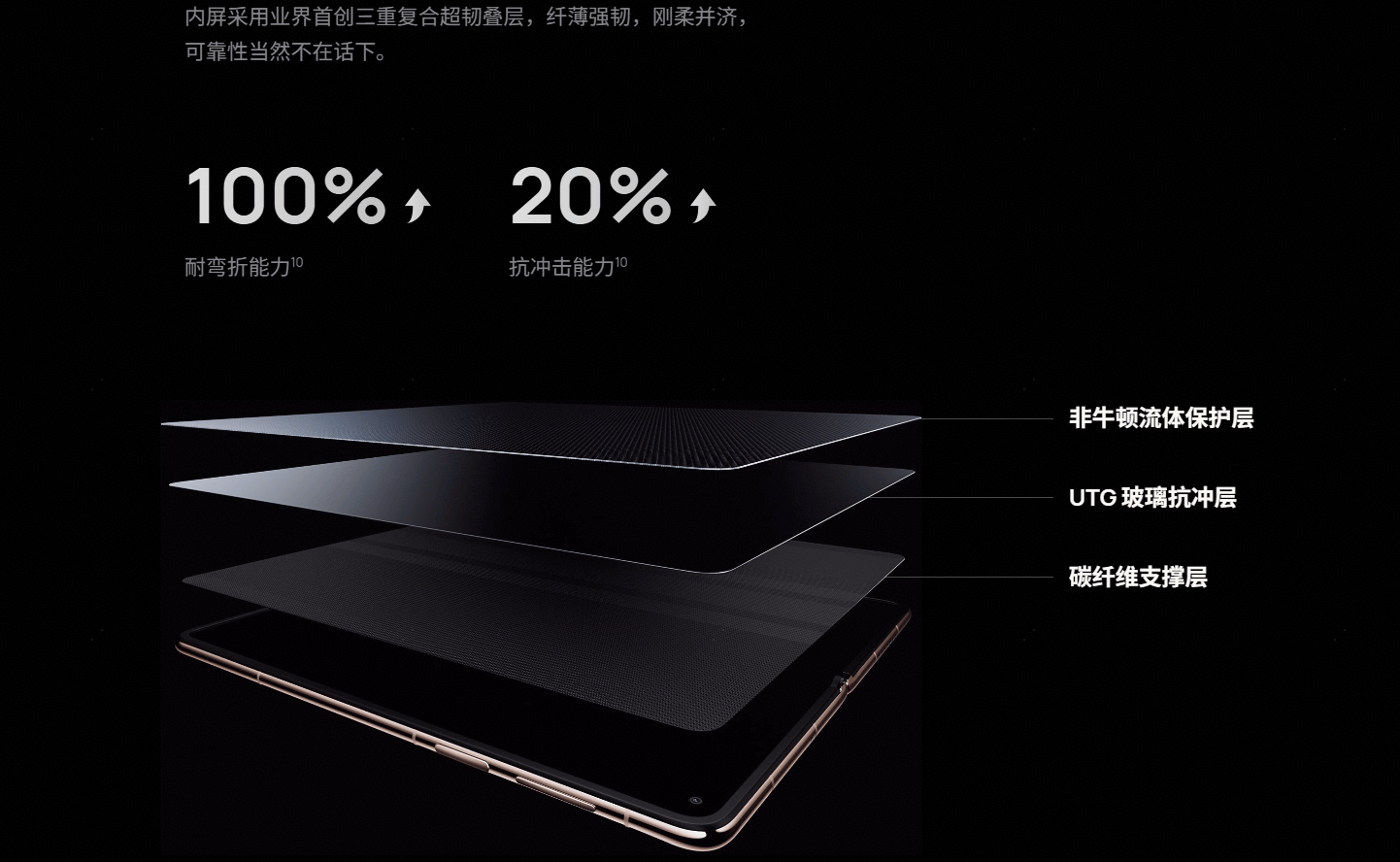 要说折叠屏最脆弱的地方,莫过于那块可折叠的柔性屏幕。为了让屏幕更耐用,Mate X7为它穿上了三层“防护服”——表层类似“非牛顿流体”的材料,日常触摸柔软,遇到突然的冲击时会瞬间变硬,分散压力;中间层是超薄UTG玻璃,负责保证屏幕的平整和抗压性;底层则使用碳纤维支撑层,提供坚实的基底,防止屏幕扭曲。
